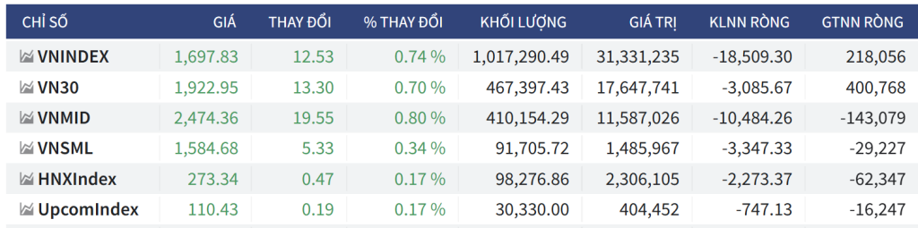 6. Chốt phiên, VN-Index tăng 12,53 điểm (+0,74%) lên 1.697,83 điểm; HNX-Index tăng nhẹ 0,47 điểm (+0,17%) lên 273,34 điểm; UPCoM-Index cũng tăng nhẹ 0,19 điểm (+0,17%) lên 110,43 điểm