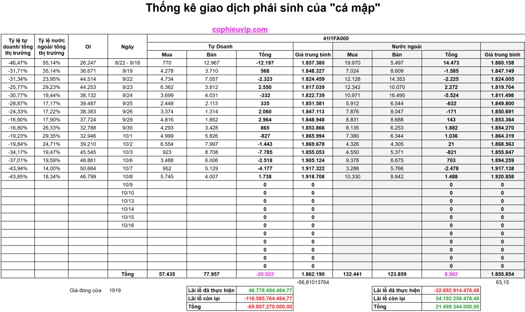 Kết luận sơ bộ: Thị trường phái sinh đã phát ra tín hiệu cực kỳ tích cực trong phiên 08/10. Cả Tự doanh và Khối ngoại đều Long ròng mạnh mẽ, cho thấy sự đồng thuận đặt cược vào xu hướng tăng của VN30. Mặc dù tổng vị thế lũy kế vẫn là Short ròng, nhưng hành động Long quyết liệt trong phiên này là tín hiệu đảo chiều quan điểm rất mạnh mẽ.