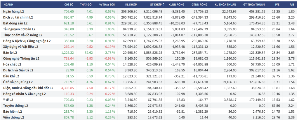 • Bán lẻ: Tăng bùng nổ +2.73% với thanh khoản cao thứ tư (1,583 tỷ VND).