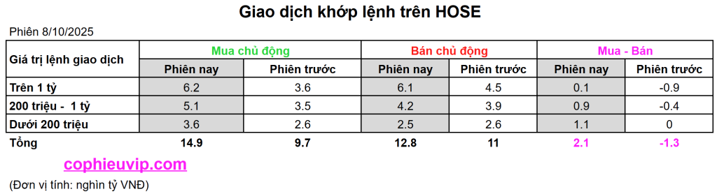 • Sự đồng thuận mua ròng của tất cả các nhóm: Cả ba nhóm nhà đầu tư (lớn, vừa, và nhỏ) đều thể hiện xu hướng mua ròng trong phiên 08/10/2025, cho thấy sự đồng thuận cao độ của dòng tiền nội sau tin tức vĩ mô.