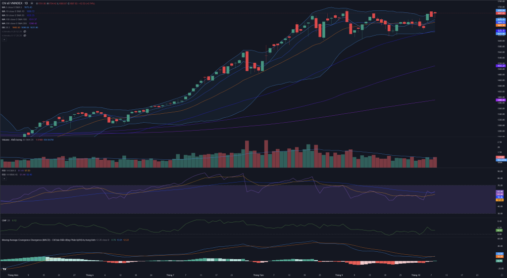 • Daily: VN-Index đóng cửa ngay sát Dải trên Bollinger Bands. Điều này cho thấy chỉ số đang tiến sát trạng thái quá mua và vùng kháng cự kỹ thuật.