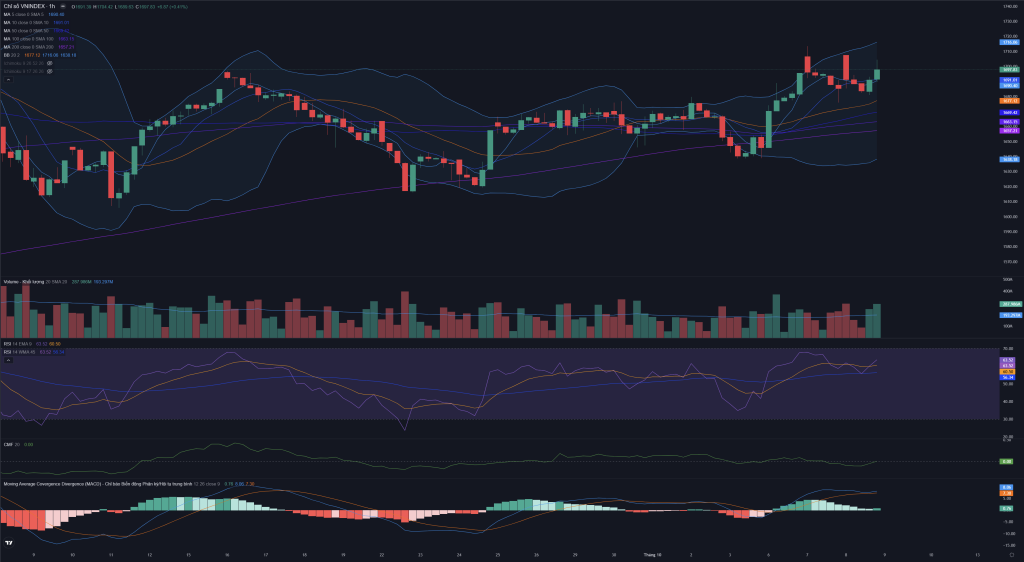 • So sánh giá đóng cửa (1,697.83) với MA: Giá đóng cửa nằm trên tất cả các đường MA ngắn hạn (MA5: 1,690.40; MA10: 1,691.01).