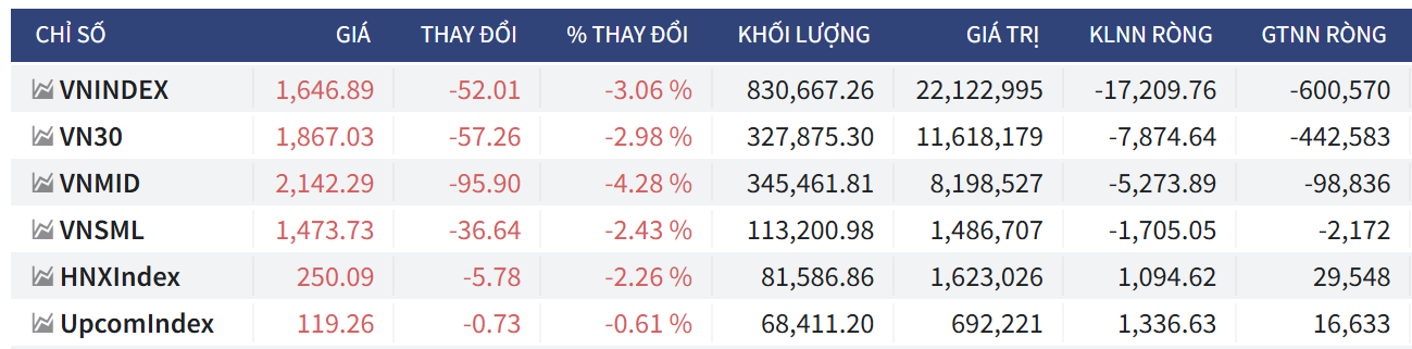 - VN-Index: Đóng cửa ở mức 1,646.89 điểm, giảm mạnh 52.01 điểm (tương đương -3.06%).