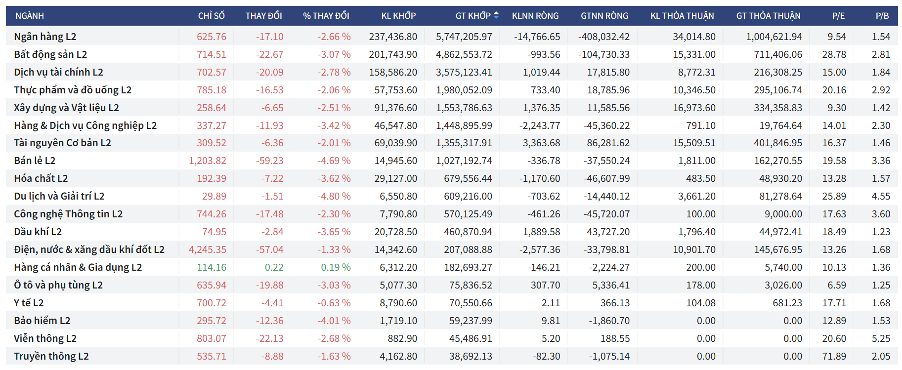 Thị trường chứng khoán đã trải qua một phiên bán tháo lan rộng và đồng thuận trên hầu hết các nhóm ngành chủ chốt như Ngân hàng, Bất động sản, Dịch vụ Tài chính, Bán lẻ, và Công nghệ Thông tin, xóa bỏ sự phân hóa tích cực của phiên trước và cho thấy áp lực giảm điểm đã chuyển sang giai đoạn tiêu cực cực độ.