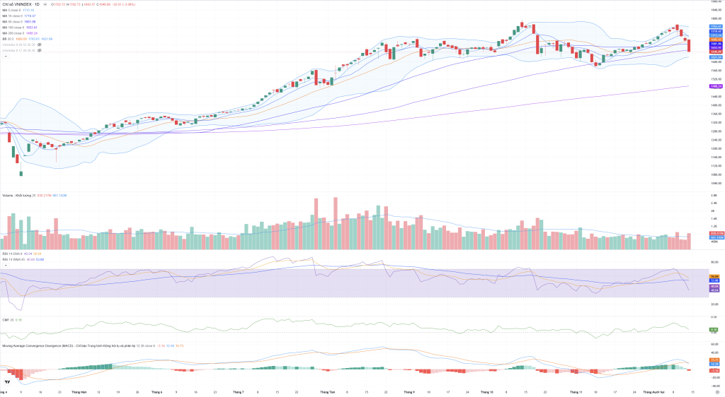 Thanh khoản (Volume): Khối lượng giao dịch (Volume = 830.217M) đã tăng vọt và cao hơn đáng kể so với đường trung bình 20 phiên của Volume (SMA20 = 661.142M). Khối lượng lớn đi kèm với giá giảm mạnh xác nhận áp lực bán tháo đã diễn ra trên diện rộng và đà giảm là đáng tin cậy.