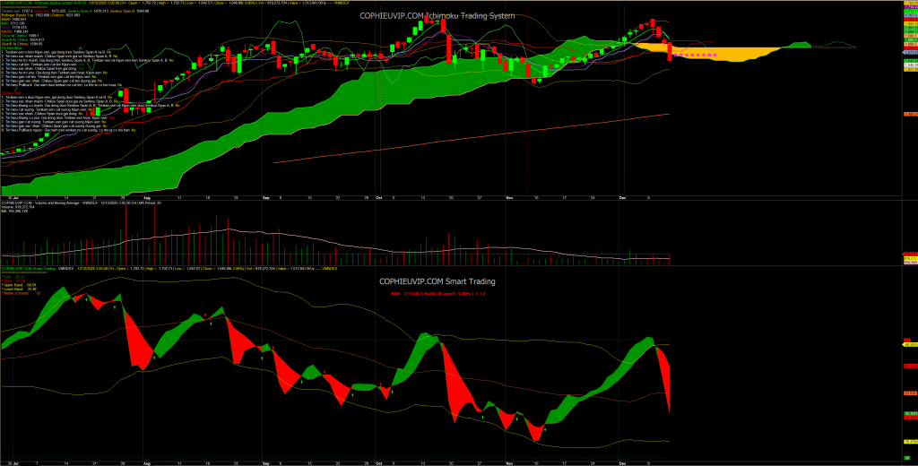 Diễn biến Giá (OHLC): O: 1,702.72 | H: 1,702.73 | L: 1,642.57 | C: 1,646.89. Phiên giao dịch ngày 12/12 tạo ra một nến giảm cực mạnh (-3.06%), là phiên giảm điểm thứ tư liên tiếp. Giá mở cửa gần như là mức cao nhất phiên, cho thấy áp lực bán áp đảo ngay từ đầu.