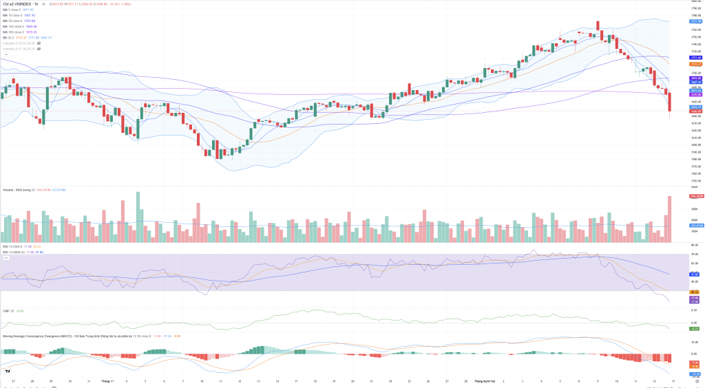 - Diễn biến Giá (OHLC): O: 1,672.60 | H: 1,677.17 | L: 1,636.59 | C: 1,646.89. Giờ giao dịch cuối cùng đã giảm mạnh 23.18 điểm (-1.39%), là một trong những nến giảm sâu nhất trong ngày. Nến cuối tạo bóng dưới khá dài (Low 1,636.59) nhưng giá đóng cửa vẫn ở mức thấp, cho thấy lực bán rất mạnh.